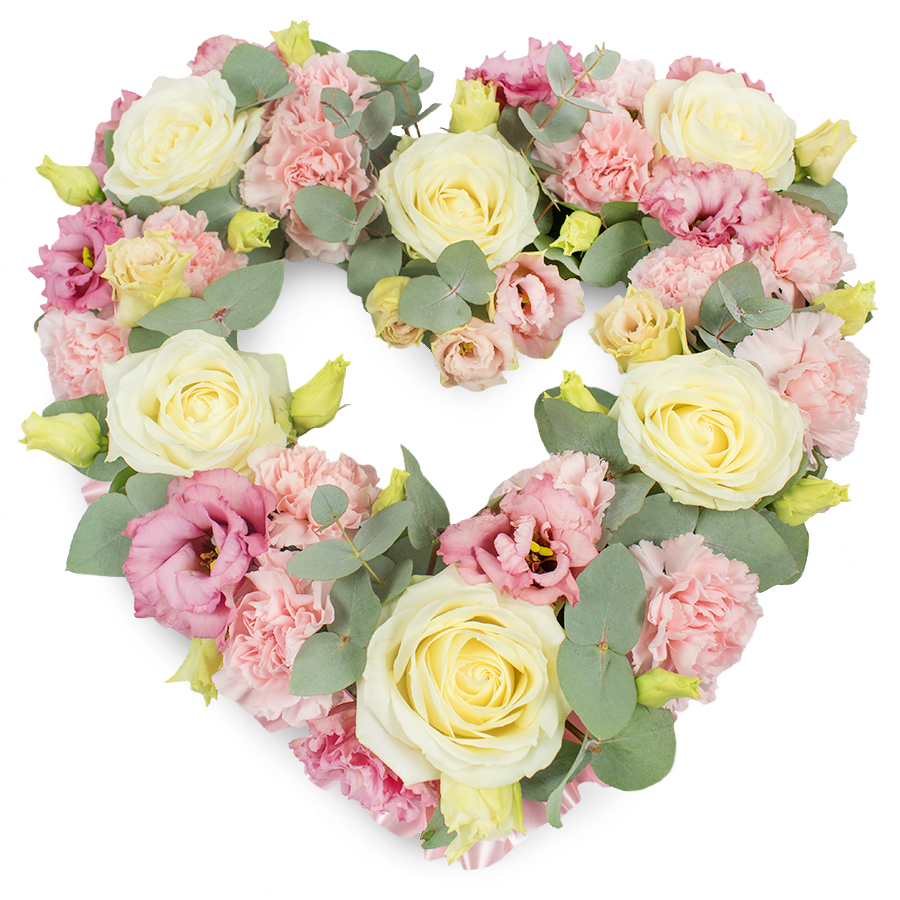 Express your heartfelt remembrance with our exquisite open heart bouquet. This elegant arrangement features a stunning combination of white roses, pink carnations, pink lisianthus, and eucalyptus leaves, all hand-selected to ensure exceptional freshness and beauty.